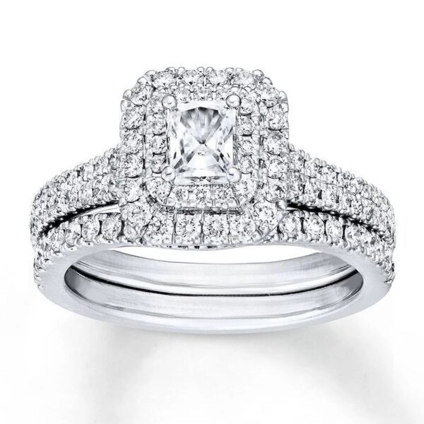 Dazzling rows of round diamonds surround a spectacular radiant-cut diamond center to create the main attraction in this stunning bridal. The 14K white gold band of the engagement ring and matching wedding ring gleam with twinkling diamonds, bringing the total diamond weight of the bridal set to 1 1/8 carats.